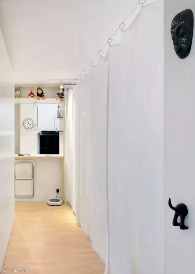 帘子的侧边变成了一个独立的休息区,客厅也瞬间变为了一个走道。
