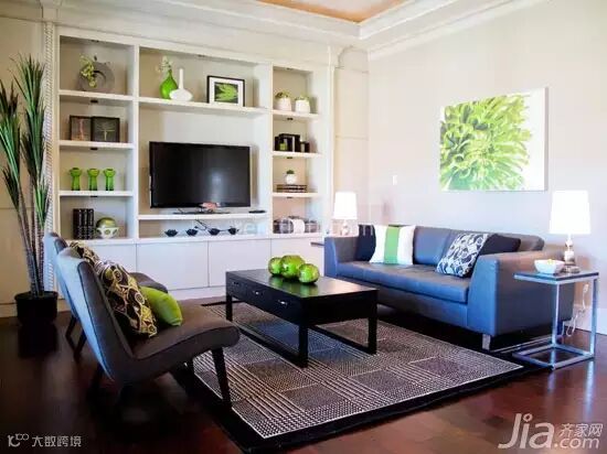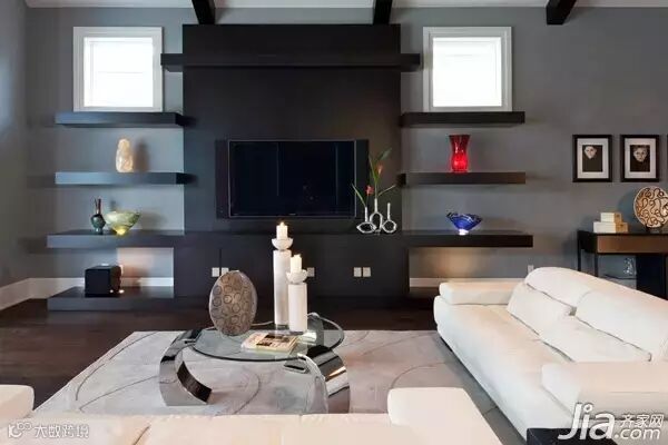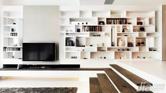 小编点评:整面墙本身就是一个强大的收纳空间,大小不一的收纳格组成实用的墙面,同时还有很不错的设计感,电视就放在墙面中间,黑白色的搭配很容易就让电视背景墙凸显出来。