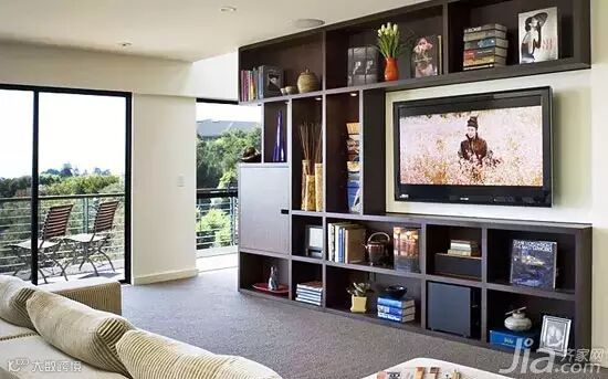 小编点评:电视柜和墙面相结合,电视的部分紧贴墙面,而四周环绕的是各种收纳格,很好的将实用性和美观度结合在一起。