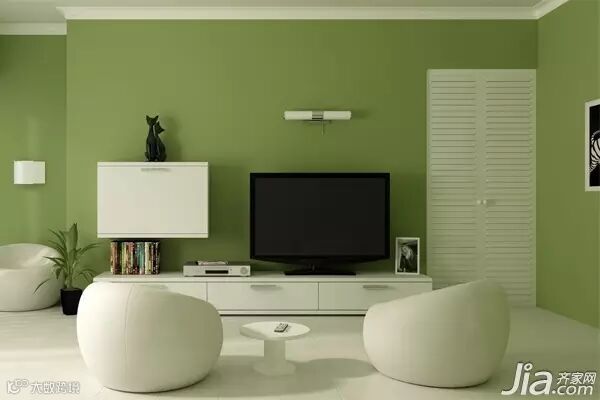 小编点评:纯净的单一色墙面,小清新的果绿色,配上白色的家具看起来干净又清爽,电视柜和墙上的壁柜能满足日常的杂物收纳,一盏小灯可以创造出光影的变幻,在简约的背景墙上营造出温馨的氛围。
