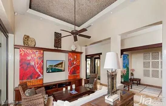 小编点评:利用有限的墙壁面积设计而成的电视背景墙,大理石般的质感,除了摆放电视机的位置,没有更多余的装饰,隐约中透着一点霸气,和带点东南亚氛围的空间倒是融合得恰到好处。