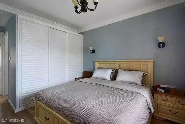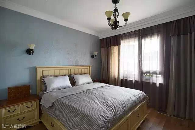 主卧的灰蓝色墙纸让这个房子看上去特别稳重,包括窗帘色系的搭配,美式的主卧大床收纳功能极强。