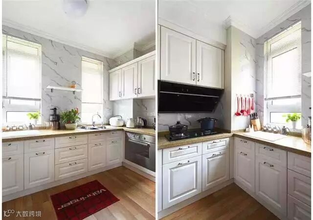 白色的实木橱柜配上米黄色的台面,颜色搭配美极了。