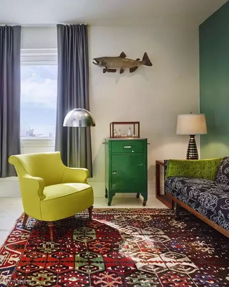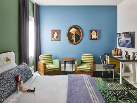 房间里的室内装潢有一种莫名的历史感,墙壁上古怪的油画与雕塑,桌上充满历史感的杯杯罐罐,还有令人眼花缭乱的地毯与沙发,每一个元素都在体现着设计师戏谑却又充满了文化气息的设计初衷。