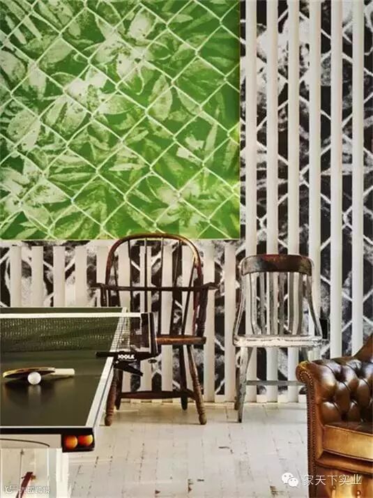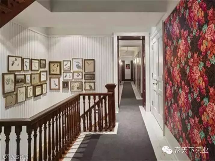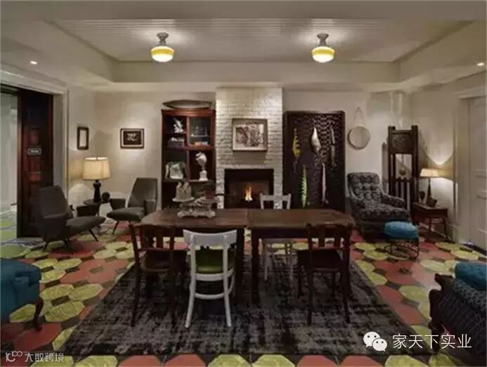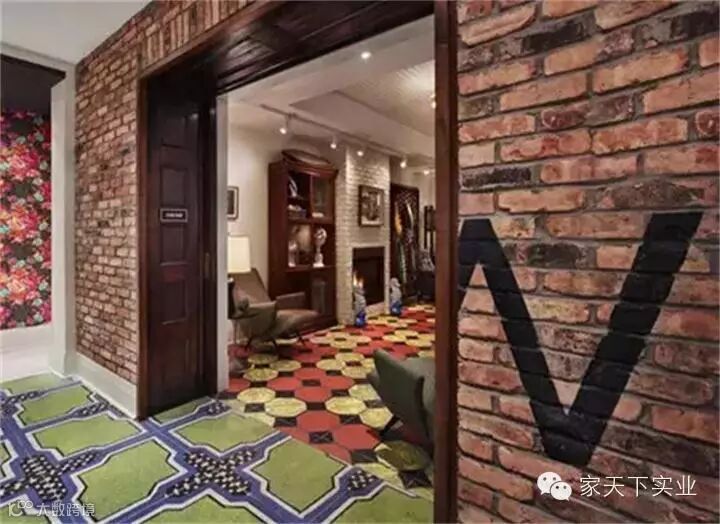 室内装饰走了欧洲复古的视觉风格,砖块砌起来的墙壁,古老的木头雕花楼梯扶手,精美的壁炉前的装饰雕塑。每一个元素都有着一种复古的意味。还有令人眼花的具有波普视觉风格的地毯和墙纸,这也正是设计师别有用心的地方,既不让整个空间显得沉闷单一,也不会张扬浮夸。