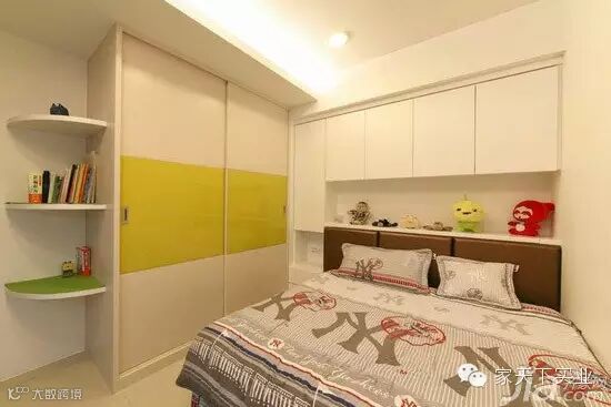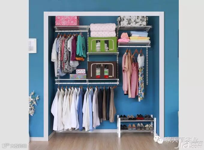 利用墙壁转角设计一个内嵌式的转角衣柜,满足储存衣物的同时还不占地。五彩的衣物以开发的形式展现,还有不错的装饰效果。