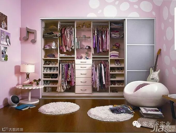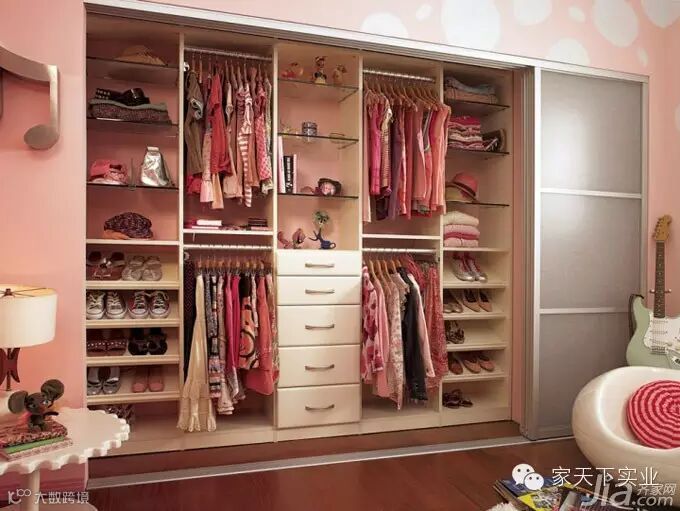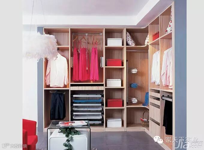 玻璃门制造通透的感觉,暗色玻璃可以阻挡一些衣帽间内部的凌乱。内部结构设计要考虑完全,悬挂、平放、抽屉、小隔间等都要适当选择。