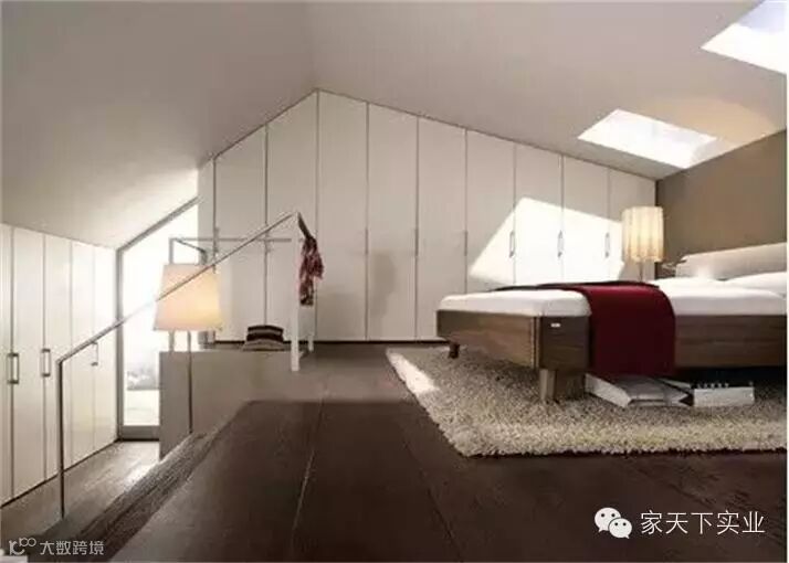 根据房间高度来定制衣柜,即使是斜屋顶的角落也能不被遗弃,发挥收纳作用。尽量将门的单元分隔宽度控制在50厘米之内,方便开启和物品存放。斜屋顶下,一般采光不会很理想,所以建议选择浅色衣柜面板。