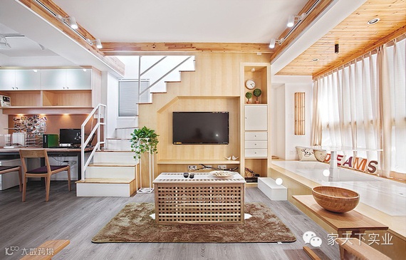 “得益于开放式设计,小客厅显得极为开阔。原来的飘窗改造成榻榻米地台,也纳入客厅区,增设了活动空间。木色与白色的配搭清新宜人,再加上落地窗带来的良好采光,把客厅映照出一份别墅般的大气。”