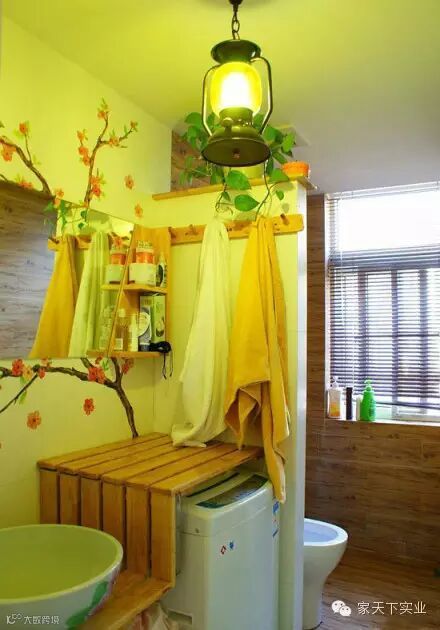 卫生间一定要用暖色调噢,这个灯和墙饰特别吧。