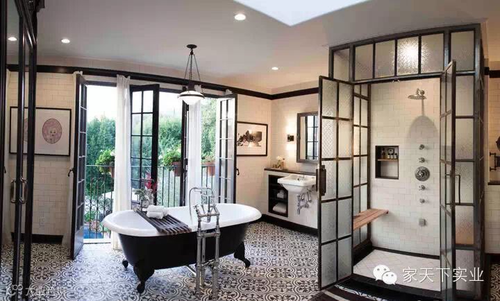吊顶十分简洁,只有一个吊灯跟其他辅助光源,挨下来的墙壁用了瓷砖来装饰,黑色边框的整体描边处理,搭配室内家具的黑色,用线条来填补空间;地面上古典样式的黑白浴缸,点燃空间情绪,最后用风格浓郁的花砖来大面积收尾,整个空间布置不紧不慢。还是卫浴间,地砖选择了六边形花砖,稳固的形状拼接在一起,成就了这番美貌。花砖的色调把握上,也让空间归于雅致。