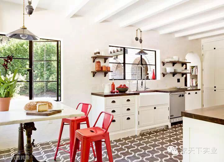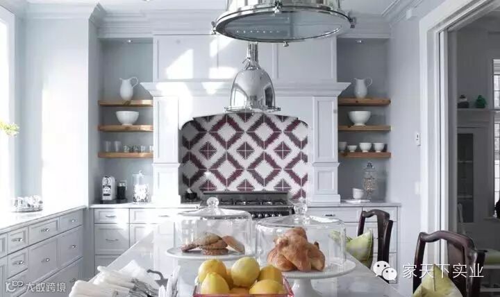 厨房里用的这款拼花砖,是花砖出镜率较高的一款。因为其看似3D的纹理效果,形成了室内的视错觉,这种隐藏的层次变化感,给予家居空间更为别致的装饰体验。除了常见的黑白色系外,雅致且浅的其他色系的同类型花砖也十分漂亮。