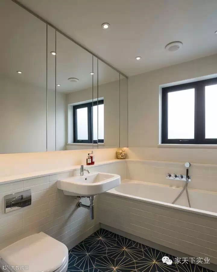 同款花砖用到了洗手池内侧墙壁,墙壁上方是镜面跟玻璃窗,虚实交映的处理方式本身就让人惊喜。下方的黑白花砖更是加重了这一方小空间的精彩程度。