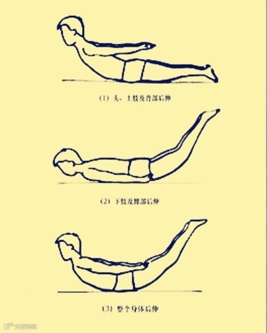 在硬床上,取俯卧位,脸部朝下,双臂以肩关节为支撑点,轻轻抬起,手臂向上的同时轻轻抬头,双肩向后向上收起(肩胛骨收缩)。与此同时,双脚轻轻抬起,腰底部肌肉收缩,尽量让肋骨和腹部支撑身体,持续3~5秒,然后放松肌肉,四肢和头部回归原位休息3~5秒再做。每天可做30~50下。刚开始时,可先做10~20下,逐渐增加。