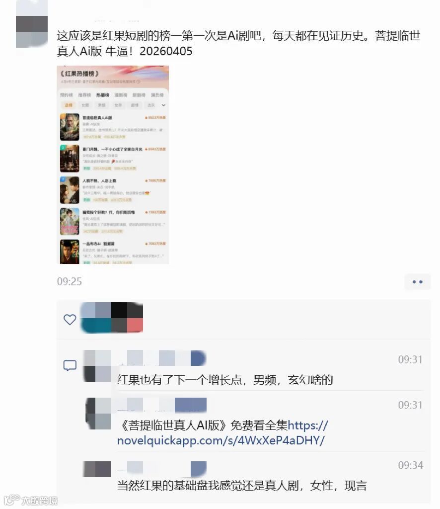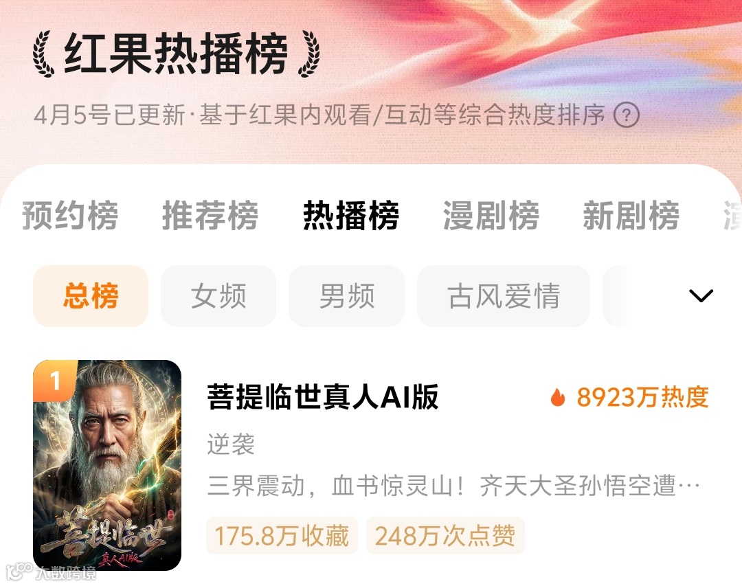 冰甜短剧创始人王小书评价称,AI仿真人剧《菩提临世真人AI版》创下红果短剧榜历史——首次有AI剧登顶榜首。尽管红果平台基础受众仍以女性向真人剧为主,但该成绩标志着男频玄幻题材成为新增长点。