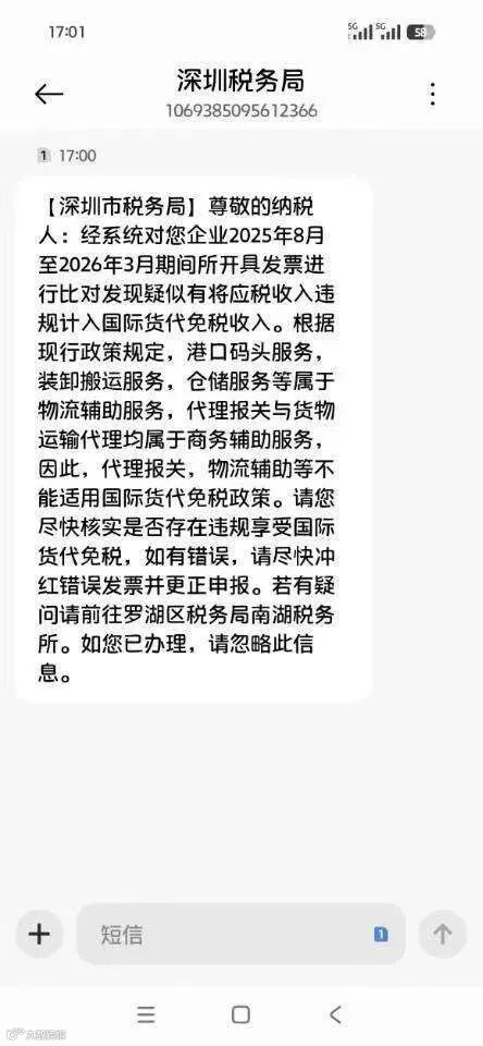 合规时代,侥幸难存。清明假期期间,深圳货代圈突传重磅消息:深圳市税务局启动针对"国际货物运输代理服务免征增值税"政策的专项税务核查,众多企业被要求排查2025年8月至2026年3月的开票记录。