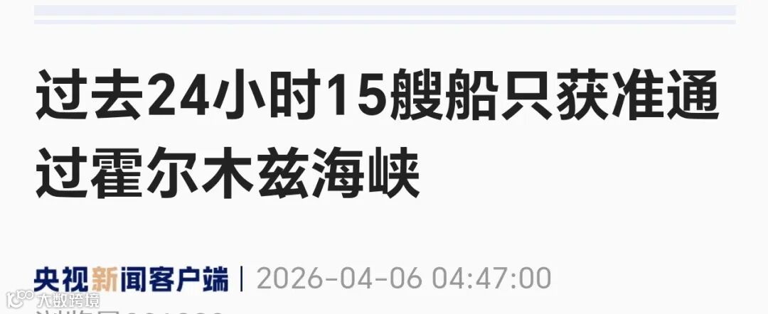 央视4月5日报道,伊朗消息显示,霍尔木兹海峡船舶通行数据证实,过去24小时内共有15艘商船获伊方许可通行。
