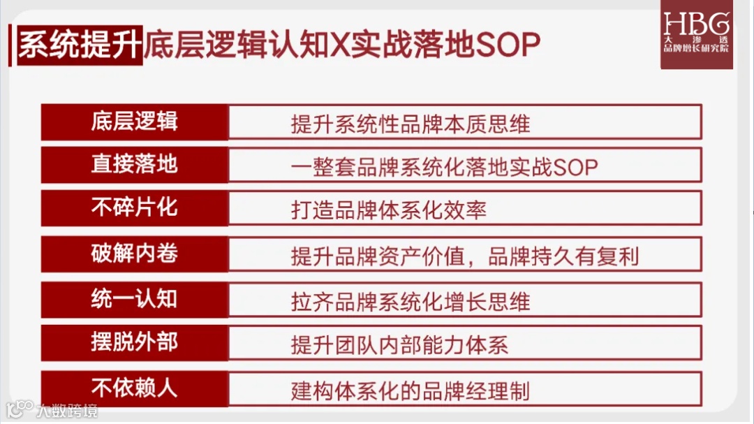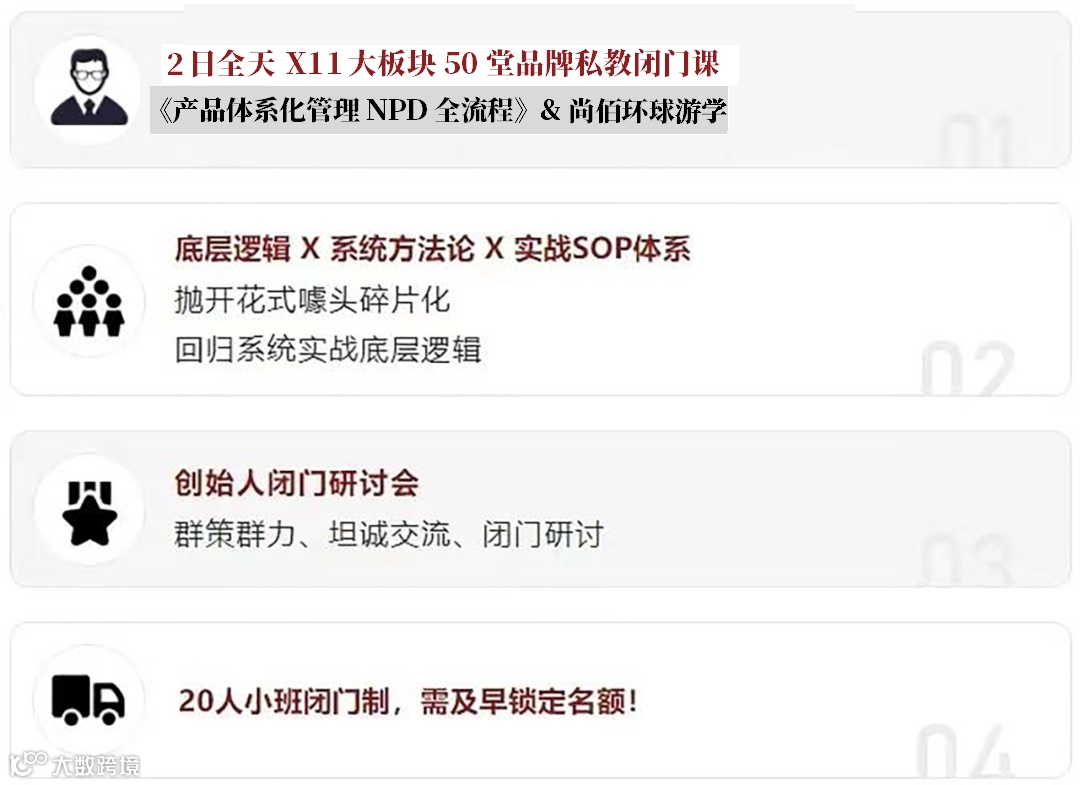 每年举办10场小班制私教课,每场2日全天闭门研讨,覆盖品牌增长全链路:品牌系统化建设、用户洞察、品牌资产、大单品策略、产品NPD流程、营销渠道GTM、品牌战役、战略组织等模块,强调底层逻辑、系统方法与落地SOP的深度融合。