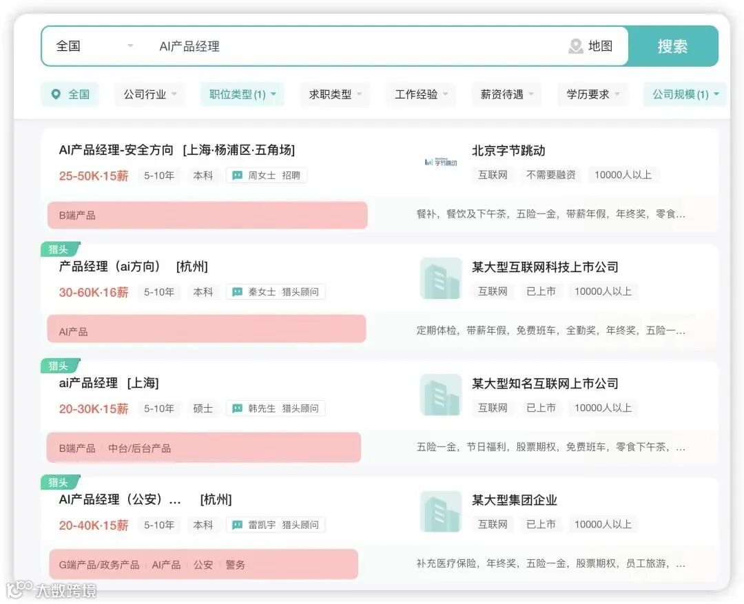 今年以来,国内外各规模企业均积极布局AI领域,人才缺口已达500万。其中AI产品经理需求尤为旺盛,薪资中位数达36k/月;头部企业含年终奖、项目奖金等,年入50万并非难事。随着AI在业务场景中价值凸显,B端方向成为主阵地,岗位要求日益细分。