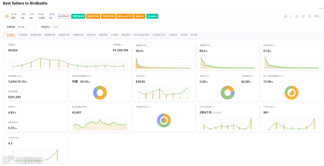 样本数据显示:新品占比18.76%,商品集中率40.4%,品牌集中度60.6%,卖家集中度57.6%,中国卖家占比59.16%,类目平均退货率4.93%。
