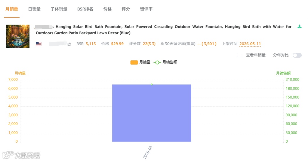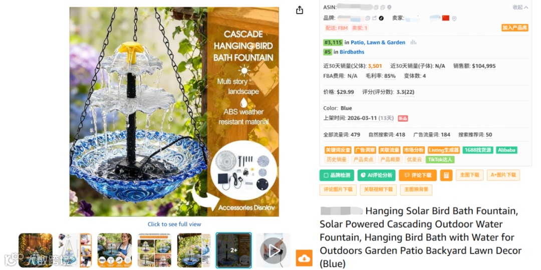 近期,亚马逊庭院类目出现一款表现突出的太阳能喷泉产品。该商品上架仅13天即实现出单,近30天父体销量达3501单,全程未投放广告,采用FBM自发货模式,账面利润率约69%。