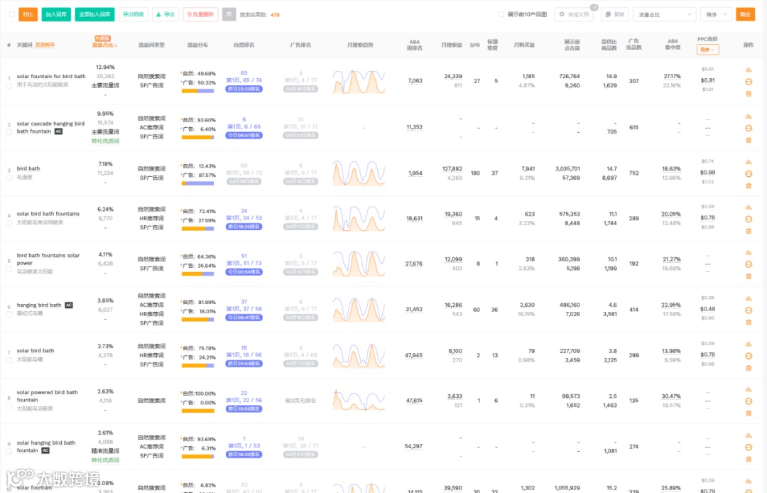 反查数据显示,主要流量词如“solar fountain for bird bath”PPC竞价为0.81美元,但该链接未投放广告,整体流量以自然搜索为主。