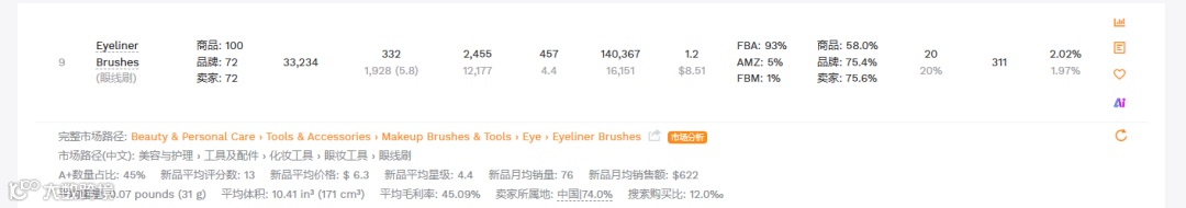 类目月总销量33234单,商品总数311款,头部垄断度5.8(高于5属中度垄断);退货率2.02%;新品月均销量76单,月均销售额622美元;新品占比仅0.2%,整体市场未形成强垄断格局。