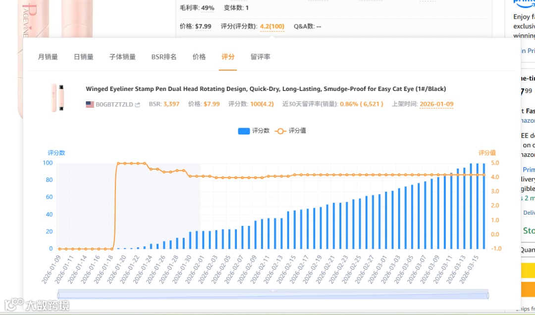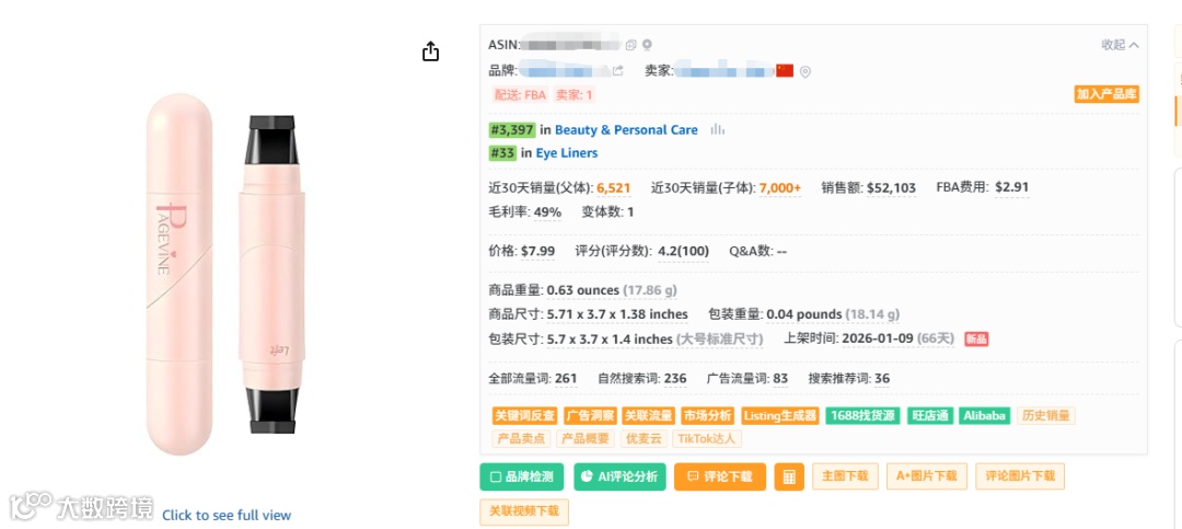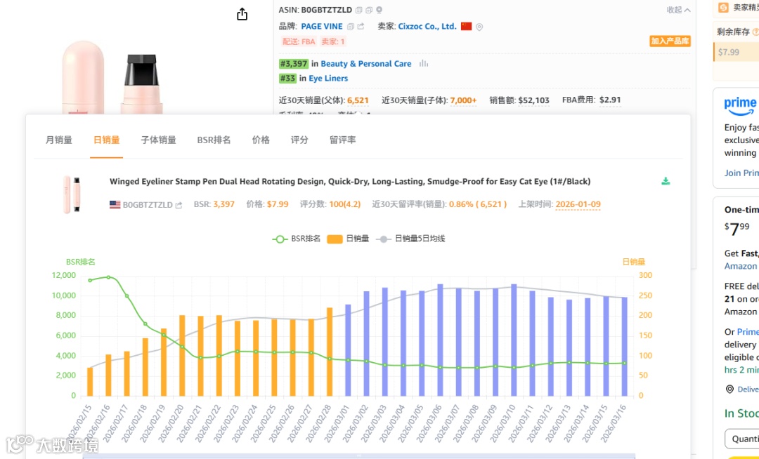 抖音平台频繁推荐的新手友好型美妆工具——眼线印章,主打3秒画出对称猫眼、快干不晕染,上架66天累计销量达6521单。
