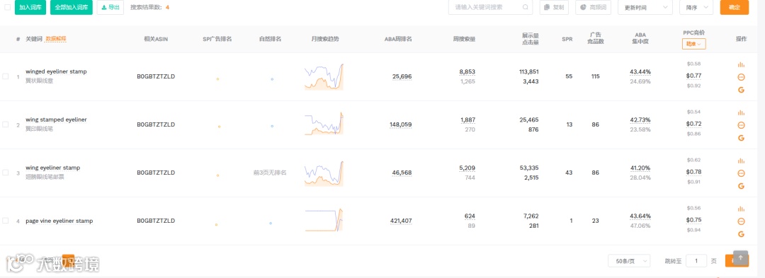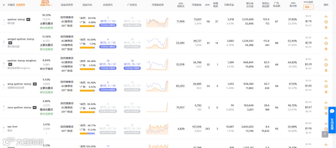 核心词“eyeliner stamp”PPC达1.97美元,转化率8.16%;长尾词“travel razors for women”PPC为1.52美元,转化率11.45%。