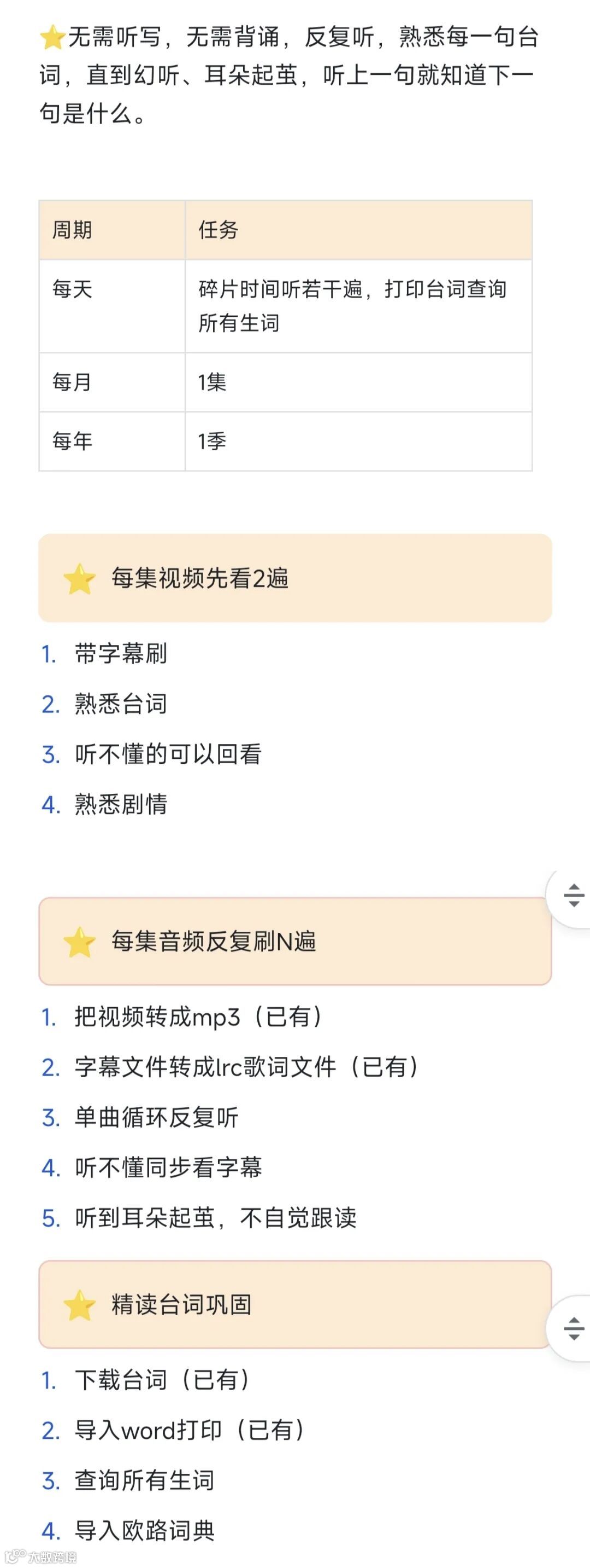 2016年,我通过该方法将《纸牌屋》第一季反复观看20余遍。当时下班后将电视音量调至最大作为背景音,通勤时用耳机听MP3并将字幕转为LRC格式。半年内完成第一季学习,每集平均观看20遍。