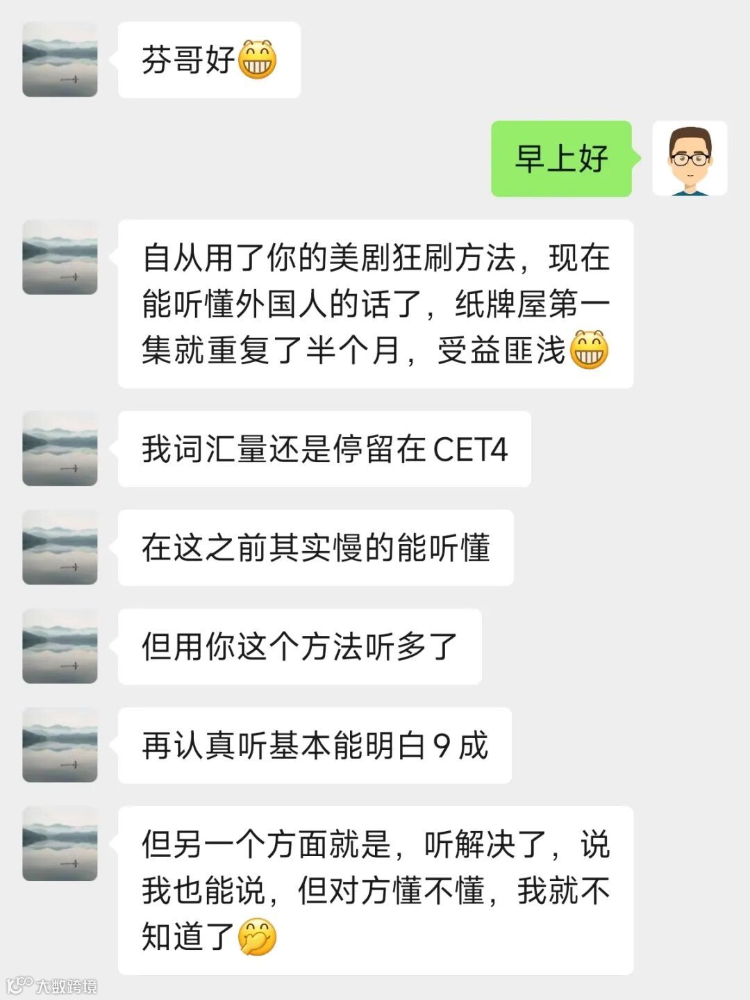 近期收到学员反馈,采用该方法半个月后即可听懂日常英语对话。知识星球学委Roy分享,在疫情期间坚持练习一年,已具备独立出国与客户沟通的能力。