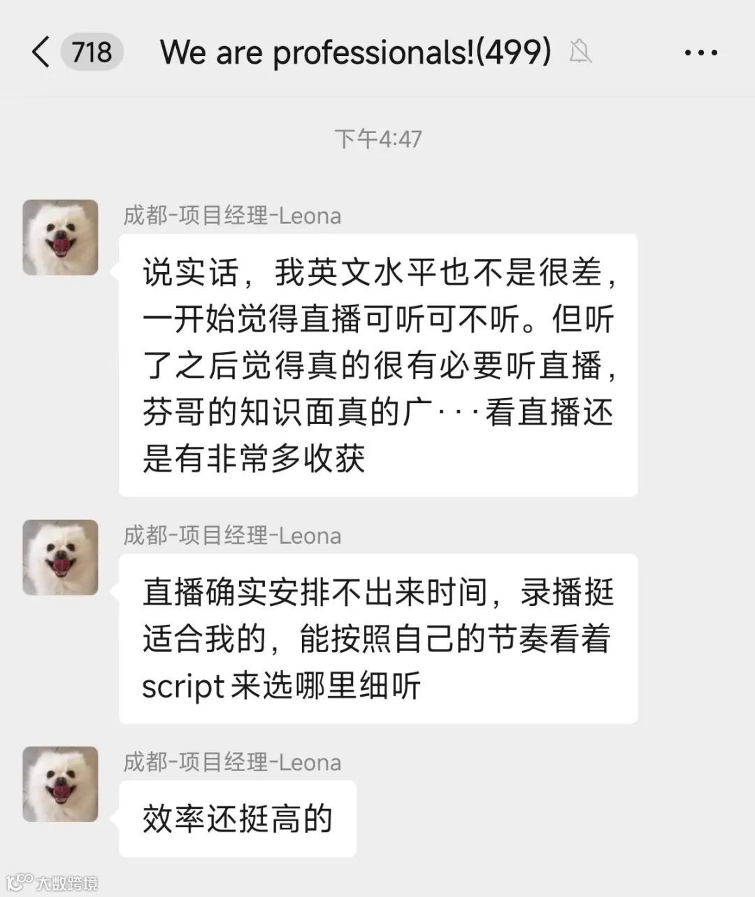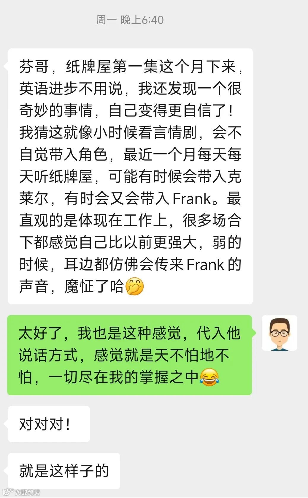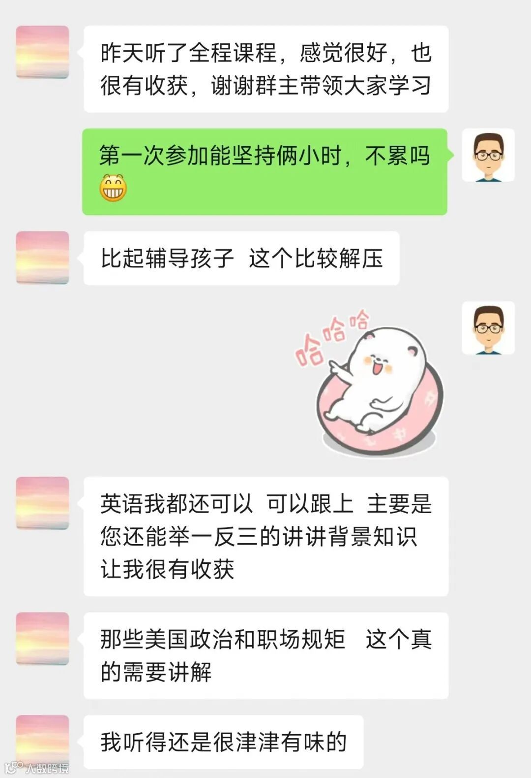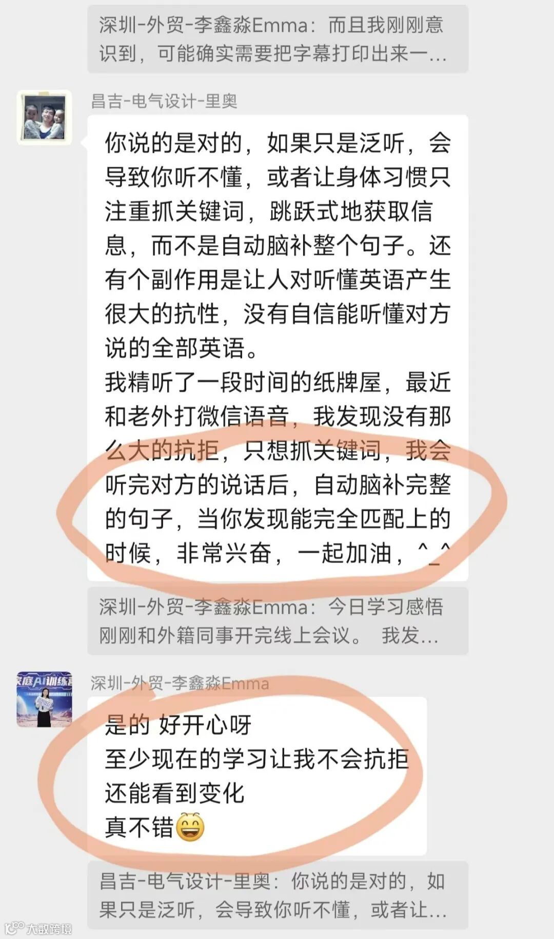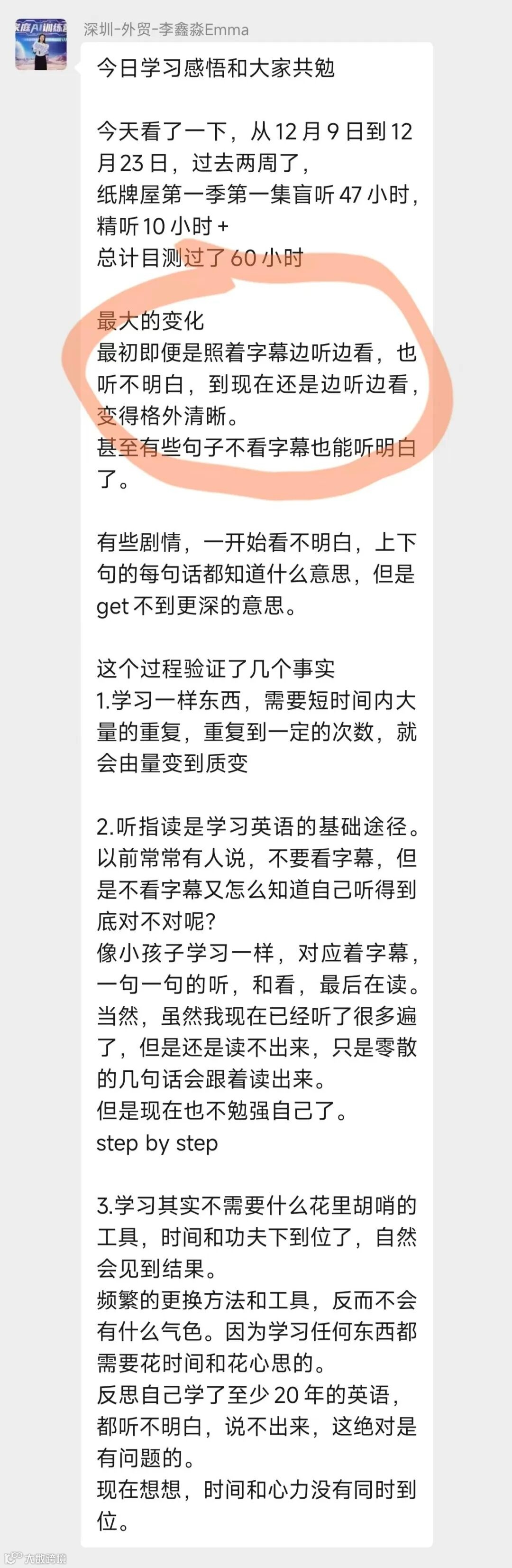 学员普遍反馈听力能力提升明显:从抓取关键词到自动补全语义,逐步实现无字幕听懂;英语理解流畅度增强,对语言的抗拒感显著降低。部分学员表示个人表达气场得到意外提升。