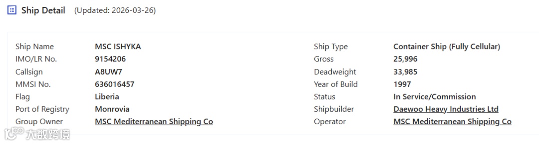公开船舶资料显示,“MSC Ishyka”轮为利比里亚籍支线集装箱船,建于1997年,船长约208米,载箱量约2500 TEU,长期运营MSC中东区域支线航线,往返于波斯湾及印度洋周边港口。