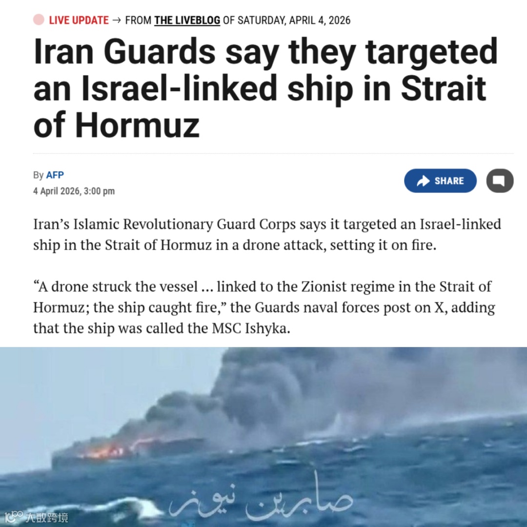 中东局势持续紧张,全球航运要道霍尔木兹海峡再现突发事件。当地时间4月4日,伊朗伊斯兰革命卫队(IRGC)宣称,其海军在霍尔木兹海峡对一艘被指“与以色列存在关联”的集装箱船发动无人机袭击,引发船体火灾。涉事船舶为地中海航运(MSC)运营的支线集装箱船“MSC Ishyka”轮。