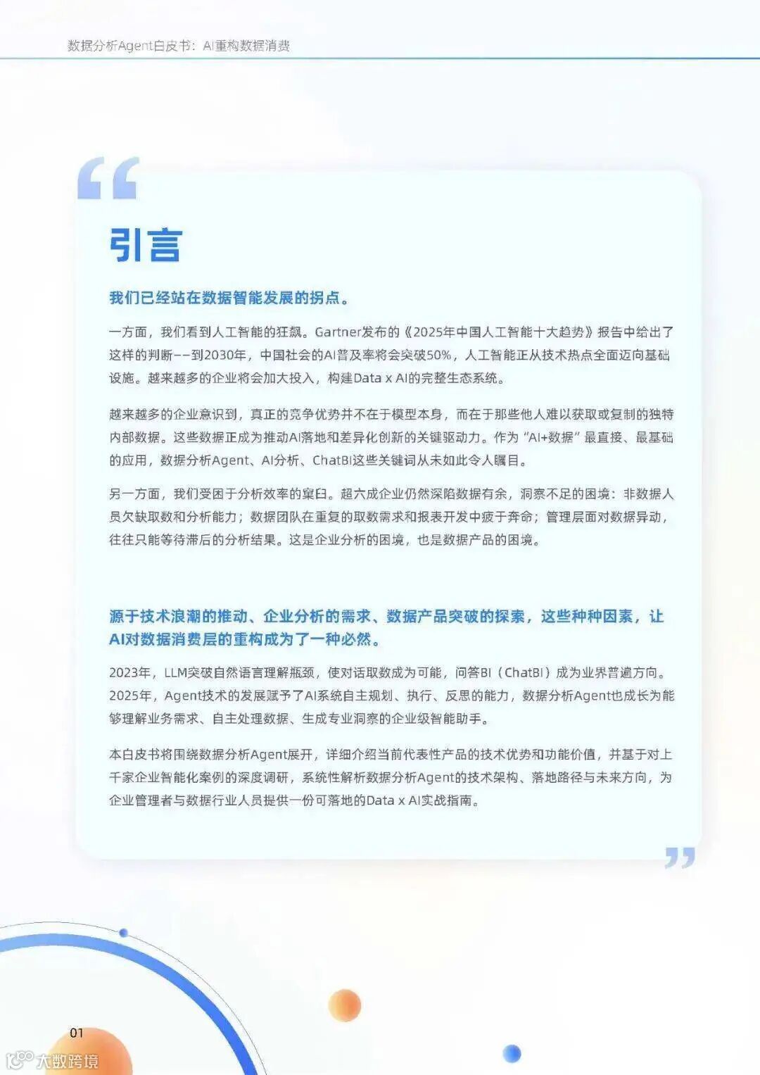 Gartner 预测,2030 年中国 AI 普及率将超 50%,AI 将成为新型数字基础设施。企业核心竞争力正转向对独特内部数据的深度挖掘与应用,数据分析 Agent 作为“AI + 数据”的基础载体,已成为行业关键发展方向。