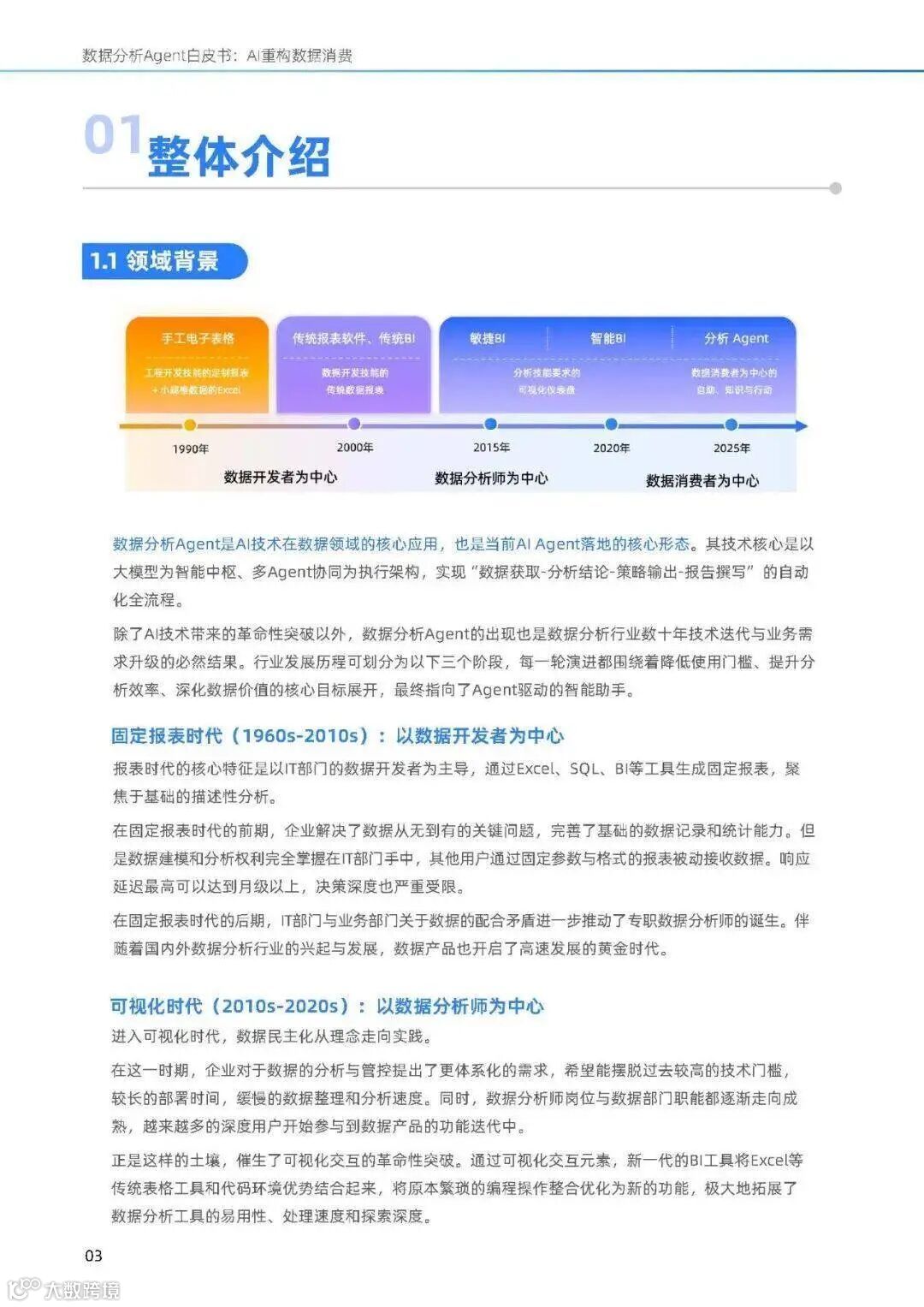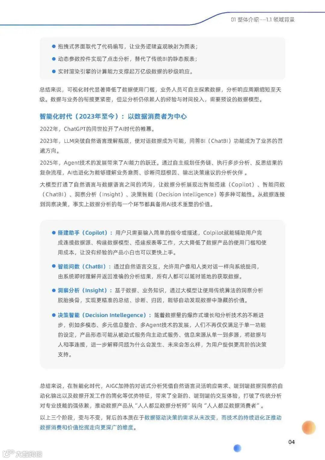 - 智能化时代(2023 年至今):以数据消费者为中心,大模型突破自然语言理解瓶颈,Agent 技术赋予 AI 自主规划、执行与反思能力,数据分析 Agent 成为企业级智能助手,推动“人人都是数据分析师”迈向“人人都是数据消费者”。