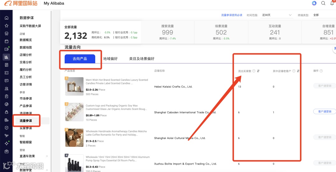 在阿里巴巴国际站搜索产品核心关键词(如“香薰蜡烛”),提取前三页结果中的以下三类店铺: