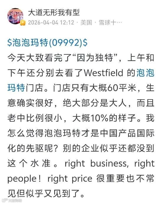 步步高创始人段永平近日公开评价泡泡玛特为"中国产品国际化的先驱"。其在考察海外 Westfield 门店后指出,该品牌 60 平米门店客单价高,且 90% 为外国成年消费者,国际化程度显著超越其他中国企业。