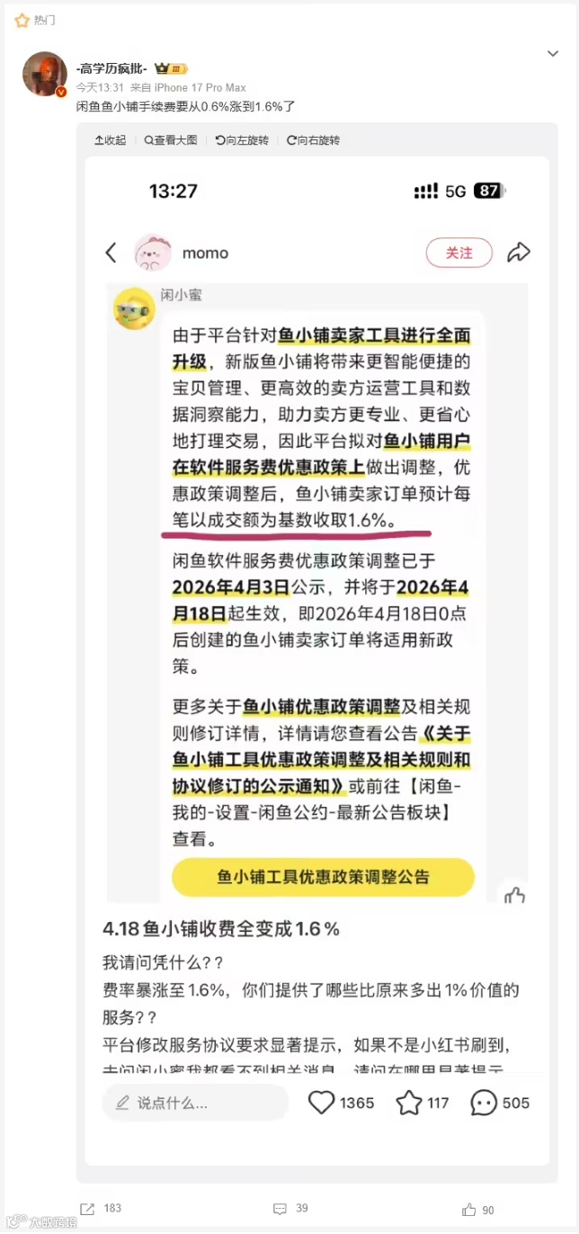 闲鱼平台宣布将于 4 月 18 日起对「鱼小铺」卖家实施新收费政策。开通该工具的用户需按 1.6% 比例缴纳软件服务费(以成交额为基数),用于支持升级后的智能管理及数据分析系统。