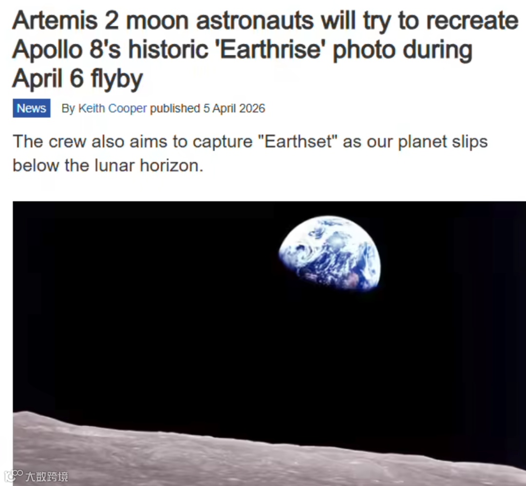 NASA 证实阿尔忒弥斯 2 号任务将于 4 月 6 日飞掠月球背面,计划复刻 1968 年阿波罗 8 号经典「地球升起」影像。这可能是人类首次从太空拍摄的最著名照片,新拍摄任务被寄望成为凝聚全球共识的象征。
