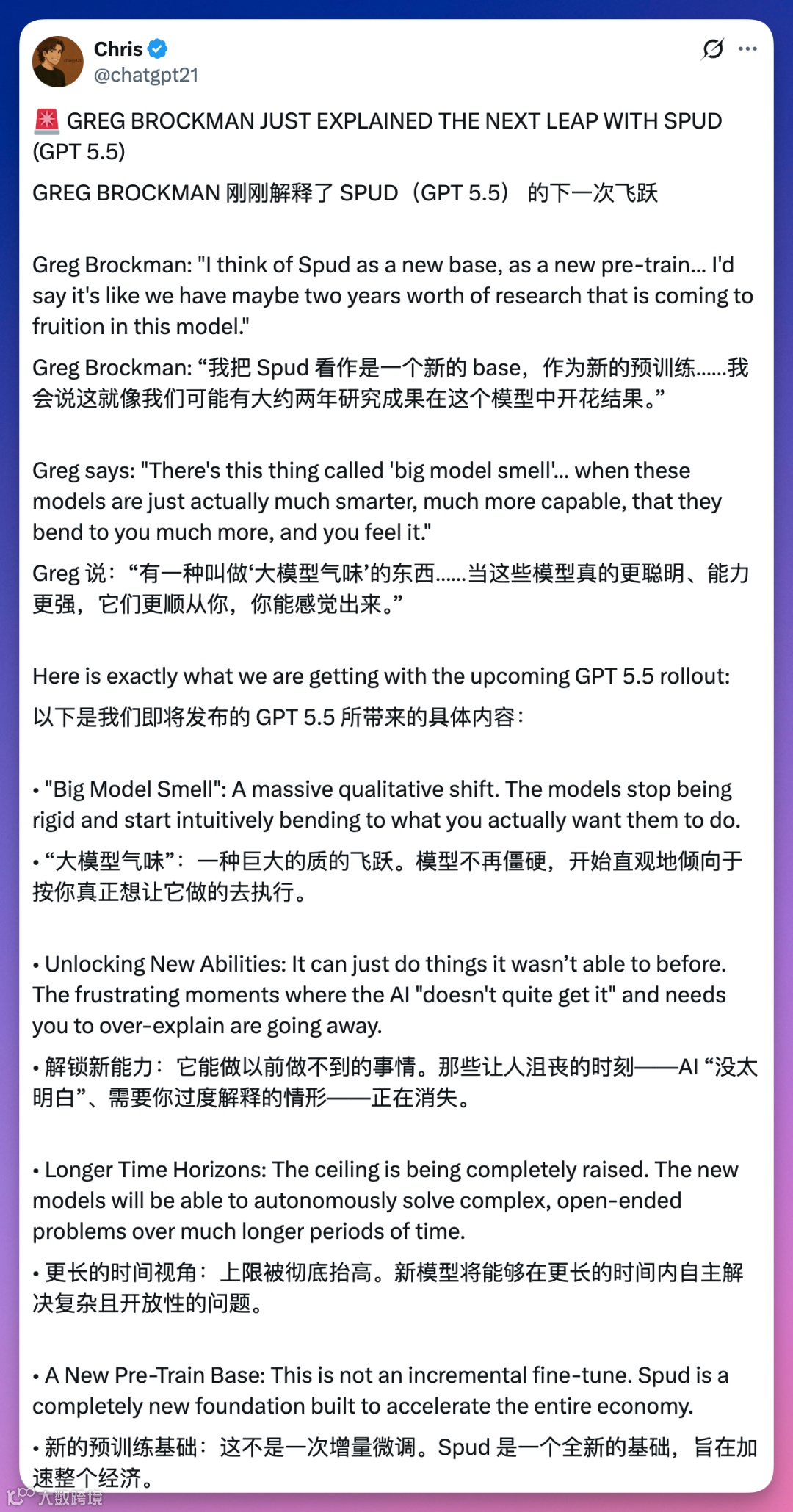 GPT-6代号“Spud”存在,预训练于3月24日完成,Sam Altman表示发布将数周内进行。但性能提升40%、200万token上下文等具体数据无可靠信源,模型命名尚待确定。