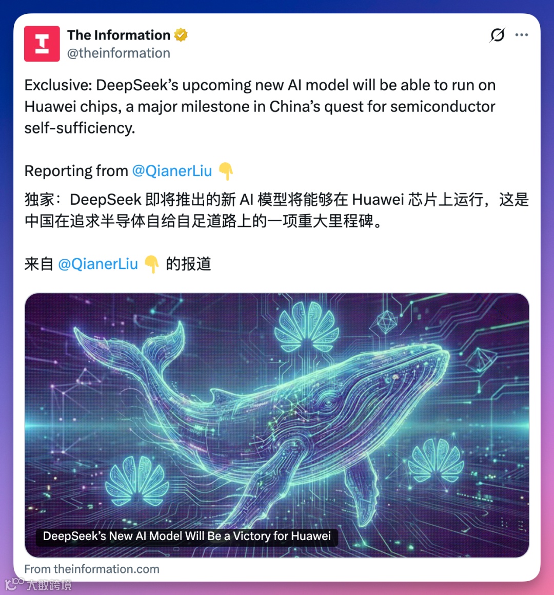 华为芯片生态仍有差距:训练芯片950DT预计今年Q4上市,追赶H200需至2027年。但DeepSeek擅长高效用算,V3训练成本仅560万美元。V4非官方爆料为万亿参数混合专家模型,支持百万token上下文和多模态,但尚未获证实。若如期发布,它将是首个专为国产芯片重写的主流AI模型。