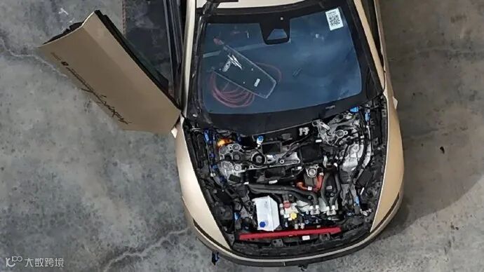 航拍显示特斯拉Cybercab内部结构,采用极简设计配备大尺寸触控屏。为保障自动驾驶安全,前舱配置大型清洗液罐服务七个外置摄像头。