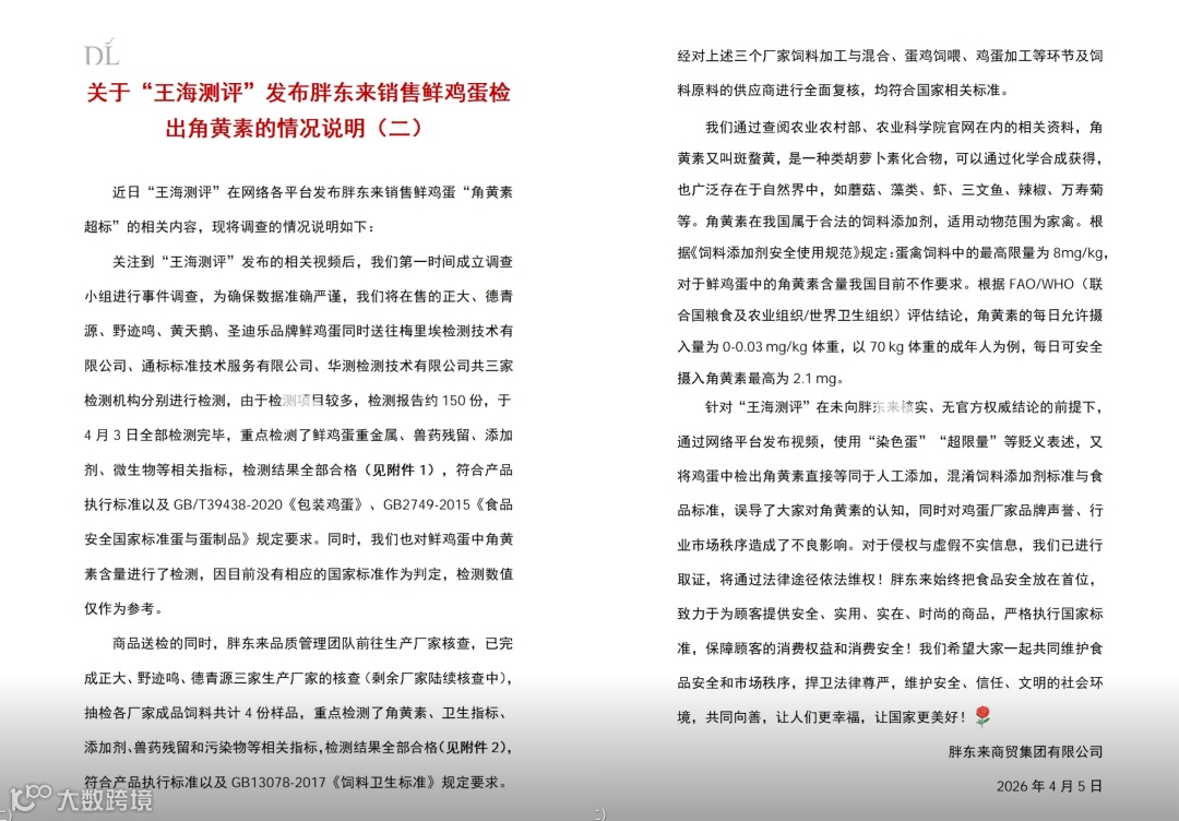 胖东来通报鸡蛋角黄素检测结果:送检的五大品牌鸡蛋完成150份检测报告,重金属、兽药残留等指标全部合格。角黄素检测因缺乏国家标准,结果仅作参考。