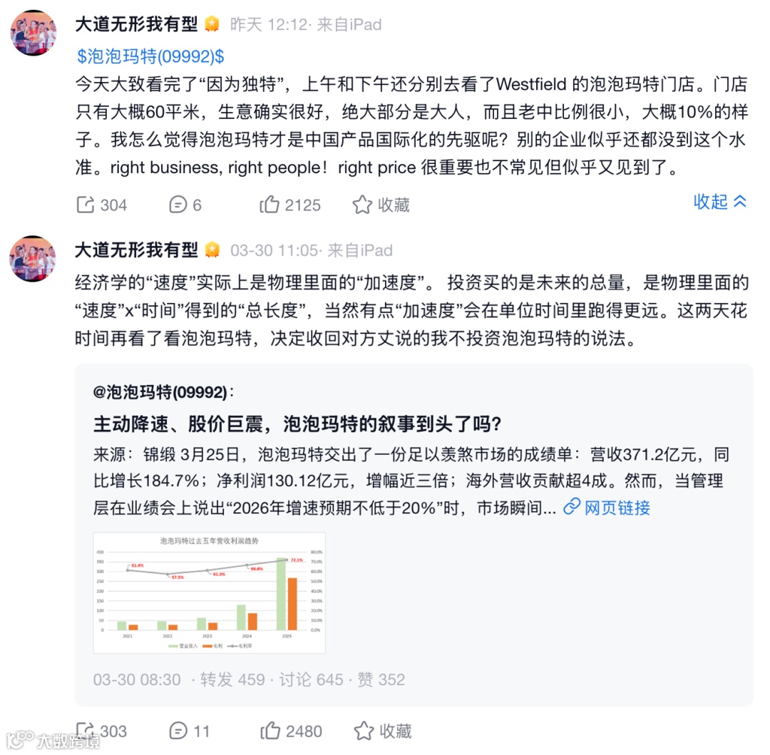 投资人段永平实地考察后改观,称泡泡玛特为"中国产品国际化先驱"。此前因不理解其商业模式表示不会投资,现已收回该观点。