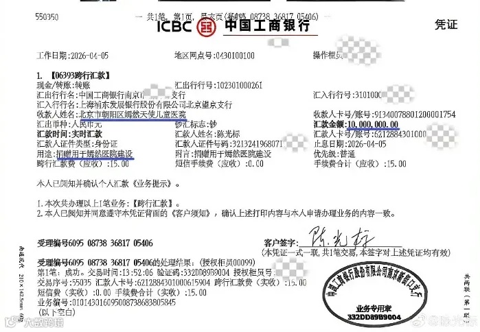 陈光标将劳斯莱斯变现1000万元捐给嫣然天使儿童医院。其声明表示,因受赠方张雪迟迟未提车,尊重对方意愿将车款用于慈善。医院方称待财务核实到账情况,若信息不实将由法务出面澄清。