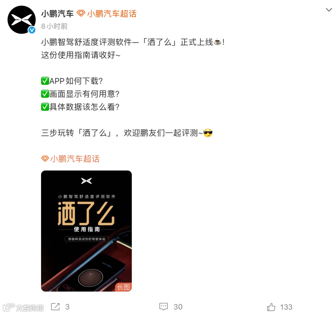 小鹏智驾舒适度评测软件"洒了么"正式上线。用户将手机置于扶手箱位置,系统模拟100%满杯咖啡,通过记录行车过程中的加速度变化,量化评估颠簸急刹等场景对乘坐舒适性的影响。