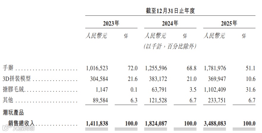 品类策略聚焦手办(2025年营收占比51%)、3D拼装模型及搪胶毛绒(2023-2025年收入从110万元激增至11.024亿元)。三丽鸥联名搪胶单品年销超3.58亿元。