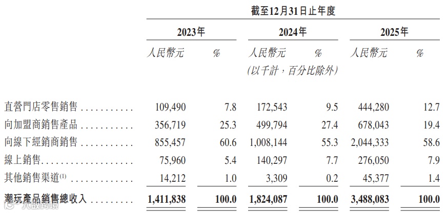 销售网络采用"直营+加盟+经销商"全渠道模式:2025年50家直营店、273家加盟店贡献收入32.1%,215家经销商渠道占比58%。名创优品全球超8,100家门店提供协同支持,同时覆盖天猫、