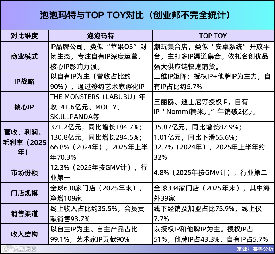 对比泡泡玛特"深度押注自有IP"(MOLLY、LABUBU等贡献超90%营收),TOP TOY采用"平台化+渠道效率"模式:通过授权IP引流,自有IP沉淀核心用户,以全品类覆盖满足广泛需求。2025年门店总数达334家(不含协同渠道),远超泡泡玛特630家门店规模,但毛利率不及其一半。